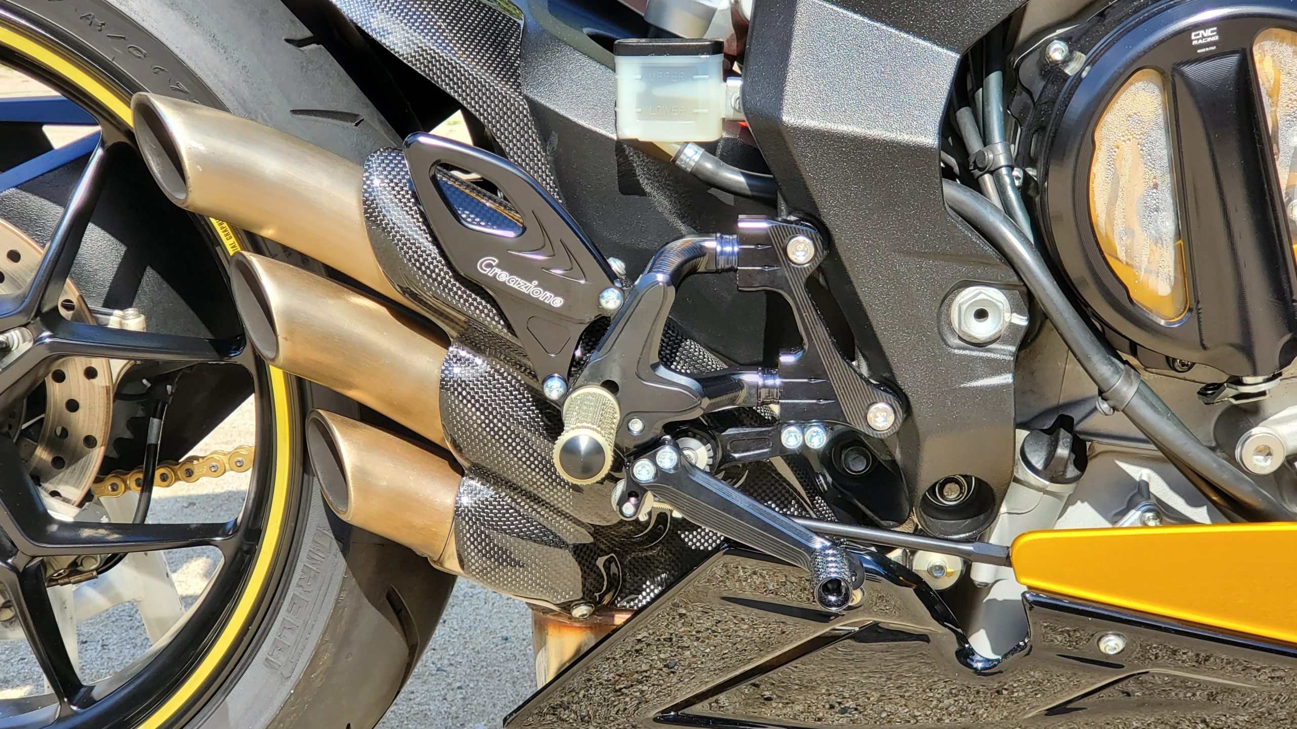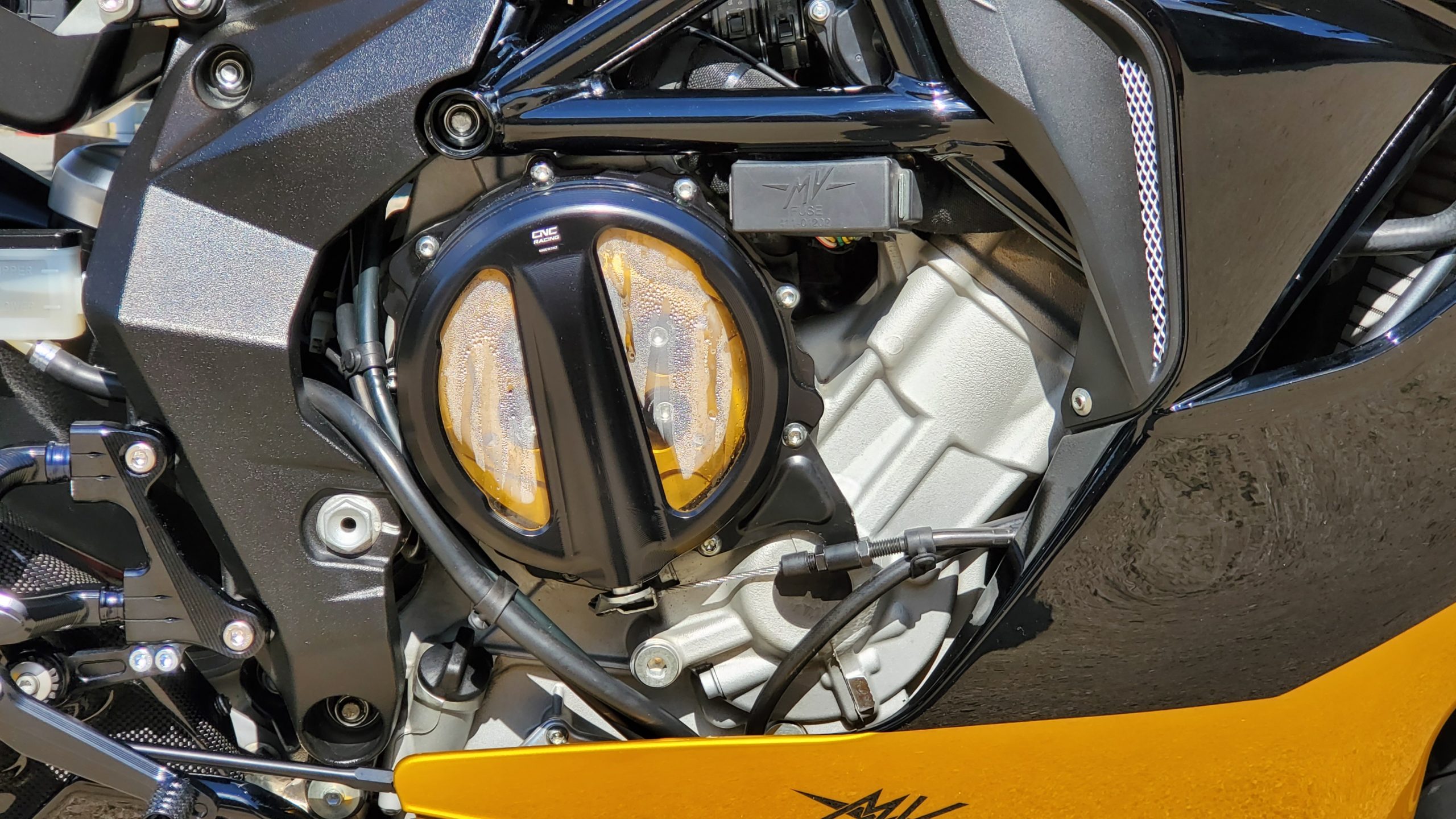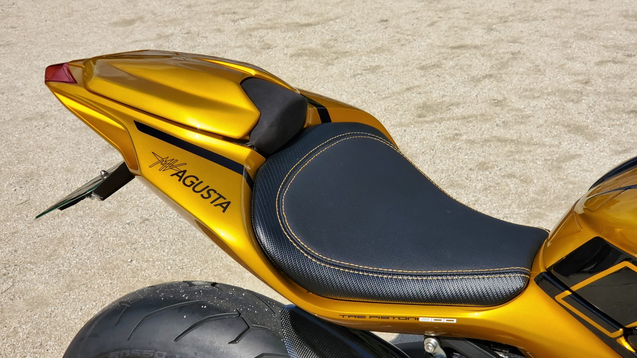 「ソーラービーム」仕様の1番の特徴は、ご覧の通りカラーリング。イエローを基調としたボディカラーに、ブラックのラインをマッチングさせ、左右のサイドカウルに入る「AMG」のロゴが印象的だ。このカラーは、メルセデス-AMGが誇る高級スポーツカー「GT S」に採用されているソーラービームがモチーフ。ダーク系イエローをベースとしたこのカラーリングが「F3 800」を、よりスポーティかつラグジュアリーなイメージに演出している。